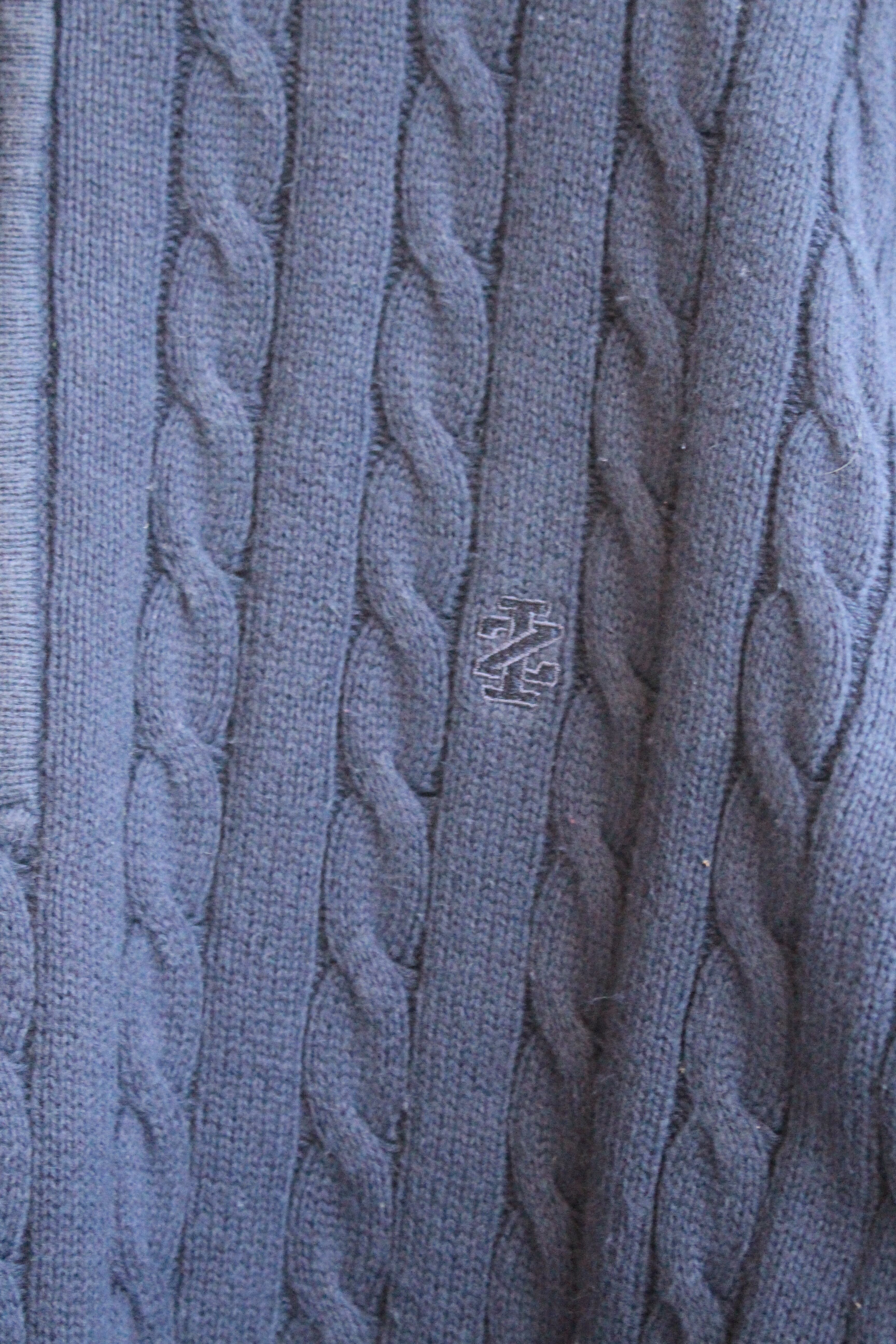 ハーフジップ、ケーブル編みとコーディネートに入れやすいデザイン。