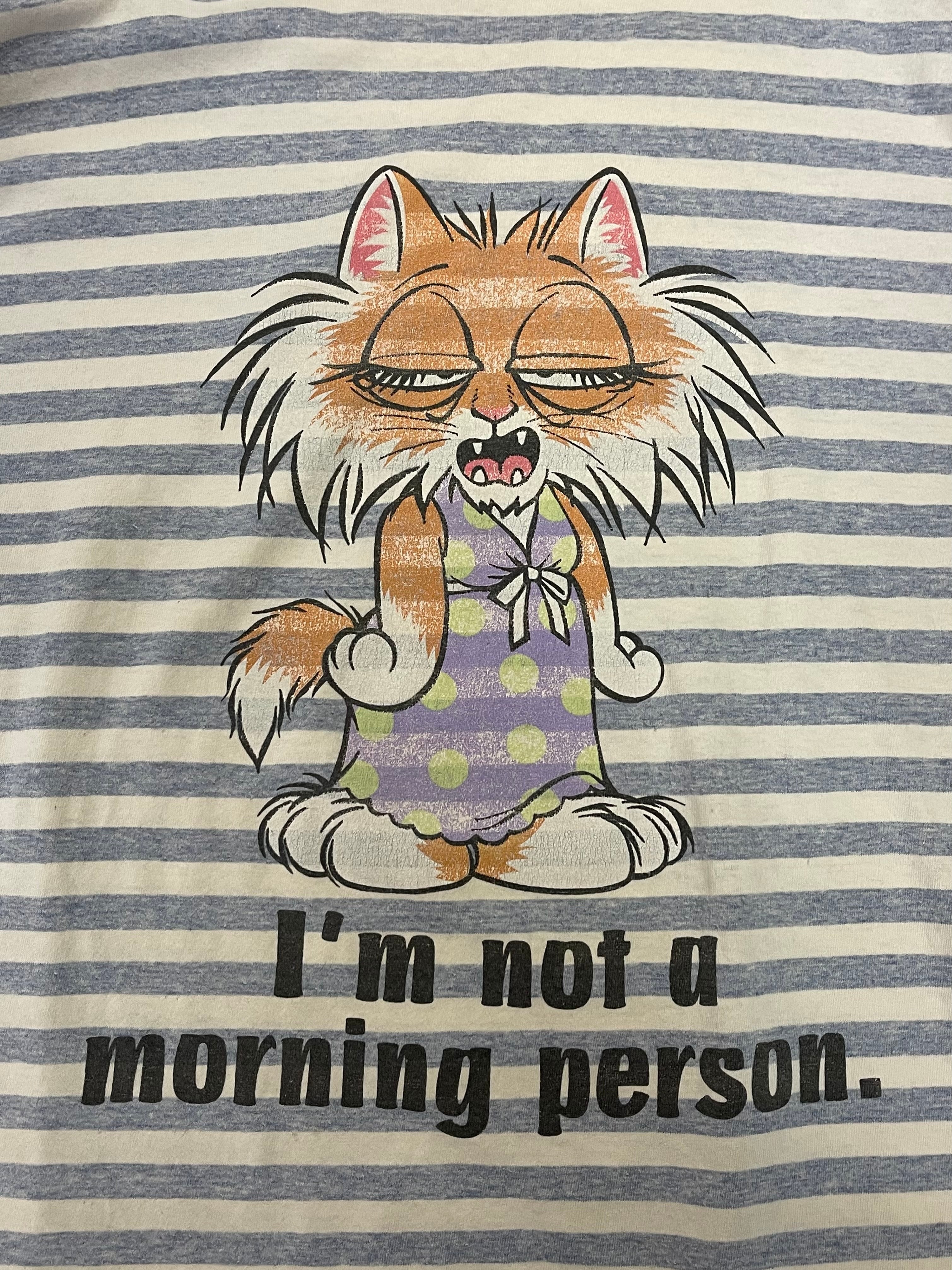 「I'm not a morning person.(朝型人間じゃないんだ。)」という一文は、効率や生産性を求められる現代に対して皮肉のこもったメッセージです。
