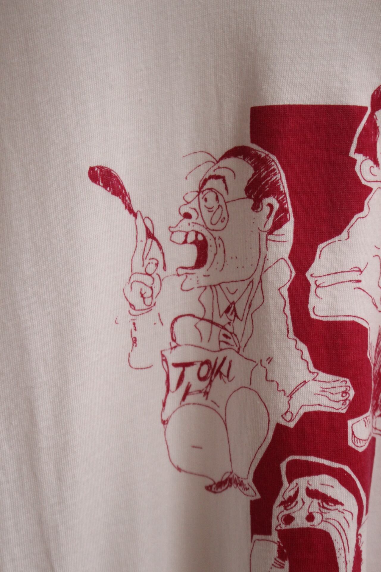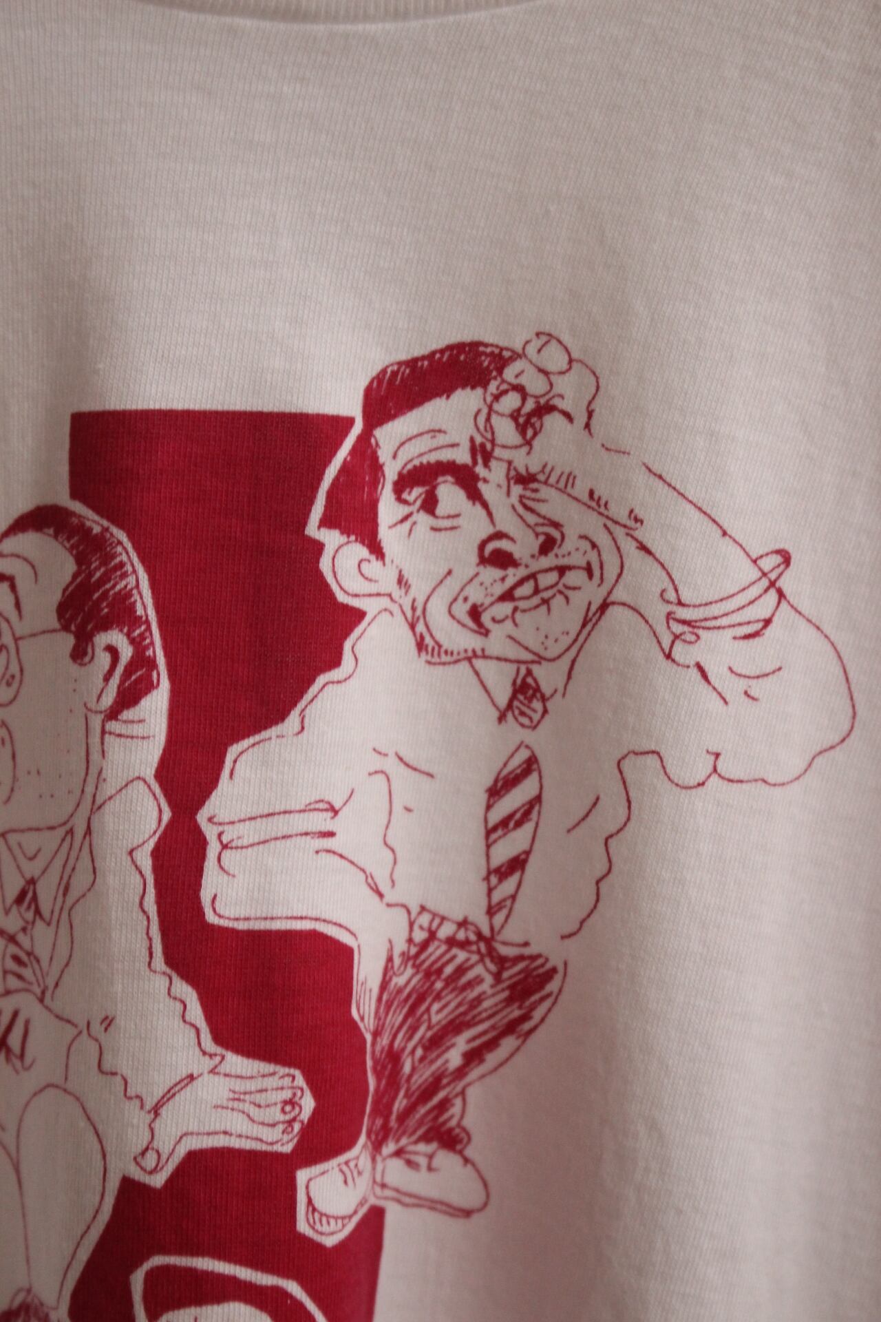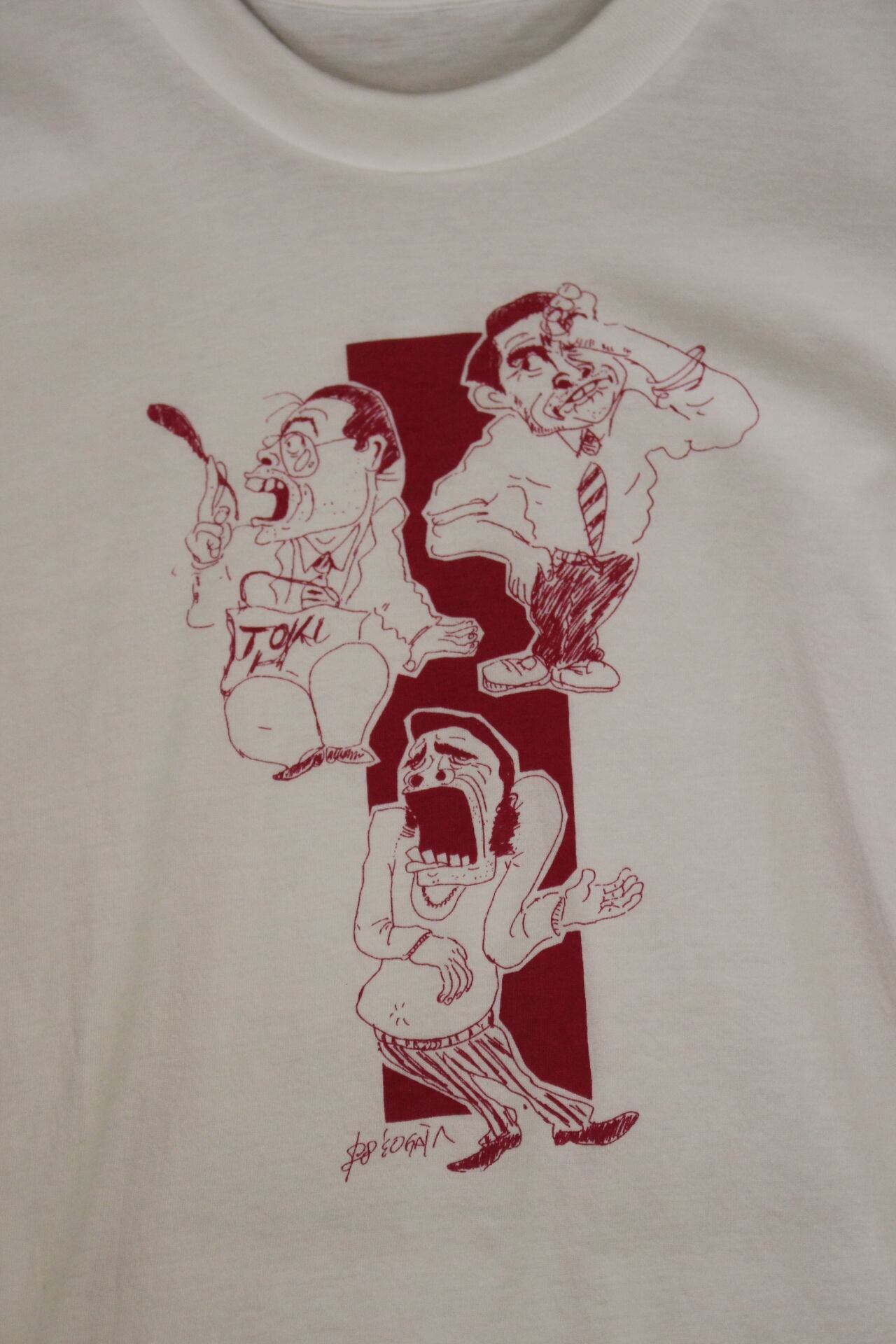 柔らかなコットンの海に、ワインレッドの線で描かれた三人の男たちのT。