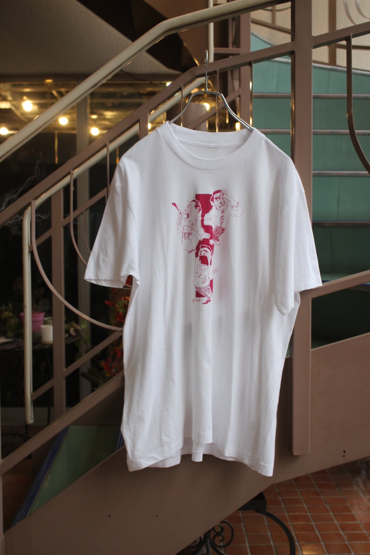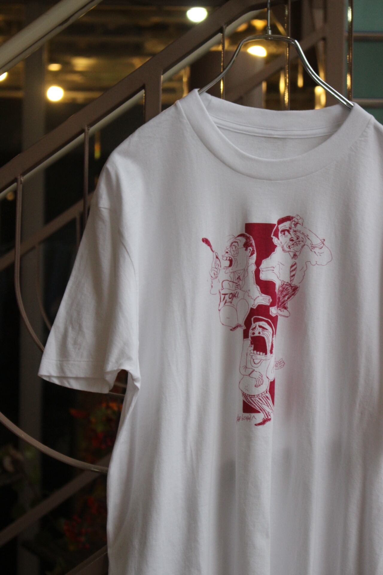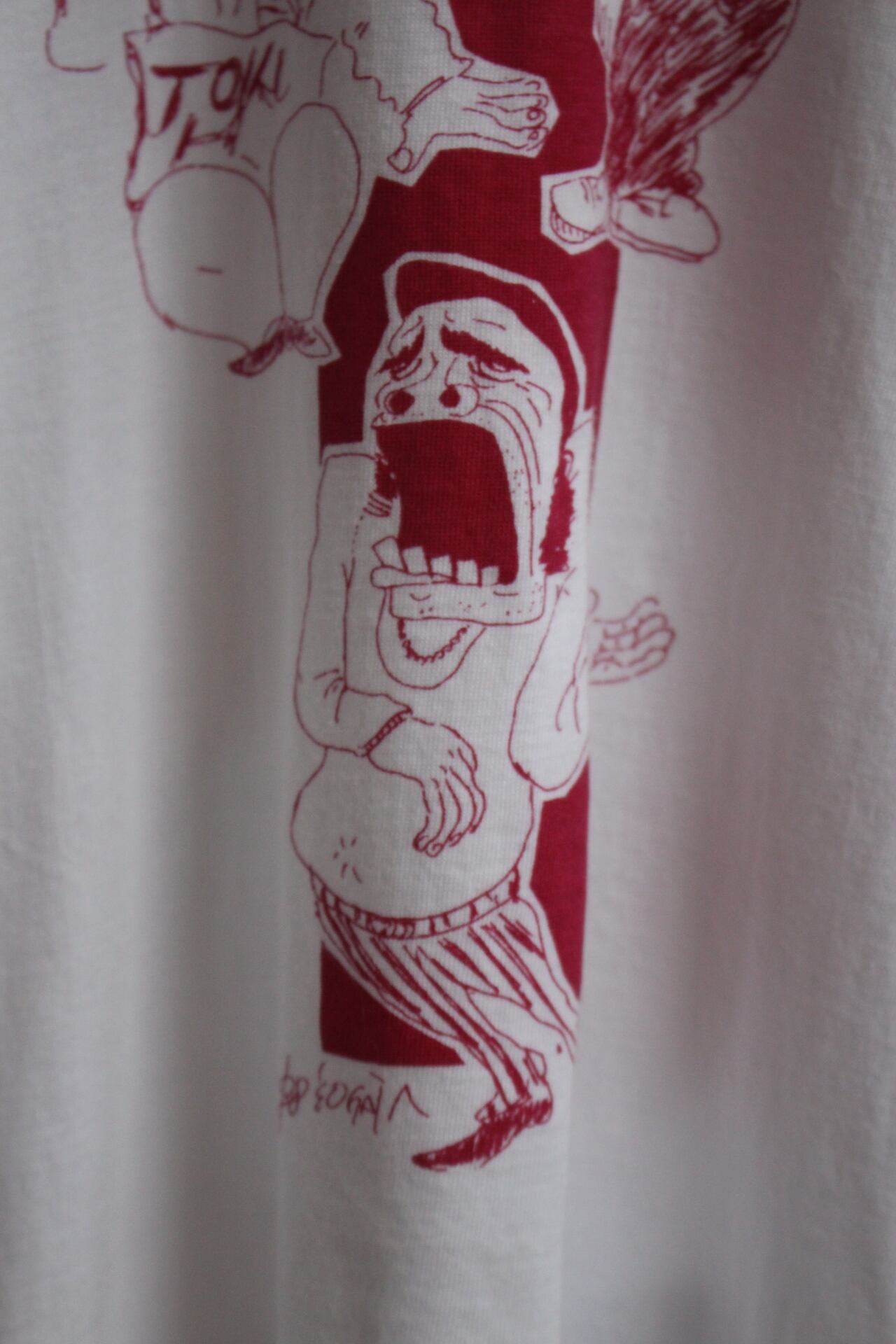 柔らかなコットンの海に、ワインレッドの線で描かれた三人の男たちのT。